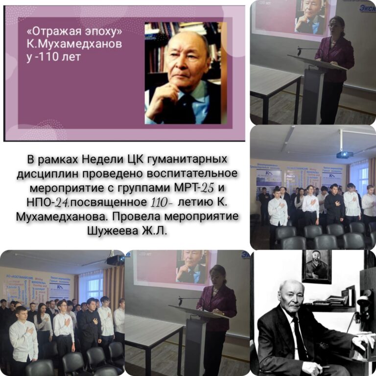 В рамках недели Цикловой комиссии гуманитарных дисциплин 9 февраля 2026 года было проведено воспитательное мероприятие, посвящённое 110-летию Мухаммедханова К.М., в группах МРТ-24 и НПО-24. В ходе мероприятия обучающимся была представлена презентация и продемонстрирован видеофильм, посвящённые жизни и творческой деятельности К.М. Мухаммедханова. Участникам мероприятия рассказали о его вкладе в развитие казахской литературы, культуры и общественной мысли, а также о значении его наследия для современного поколения.