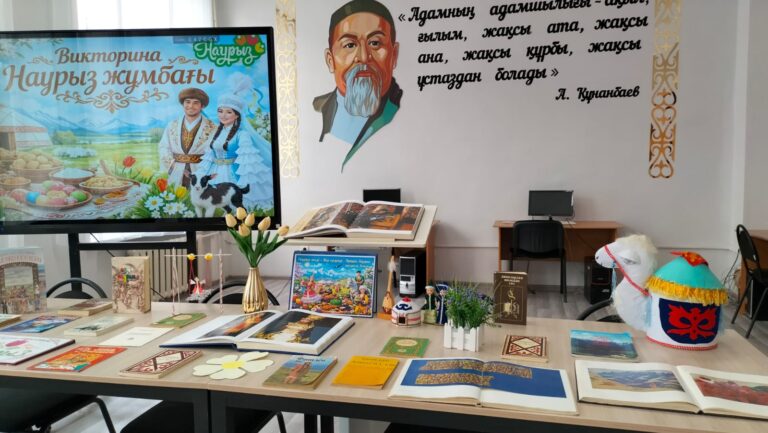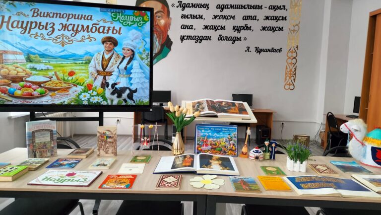 Инсталляция дополнена элементами национального колорита и символами весны, которые создают атмосферу тепла, обновления и радости. Выставка приглашает читателей прикоснуться к богатому культурному наследию народа, почувствовать дух весеннего праздника и открыть для себя красоту традиций Наурыза.