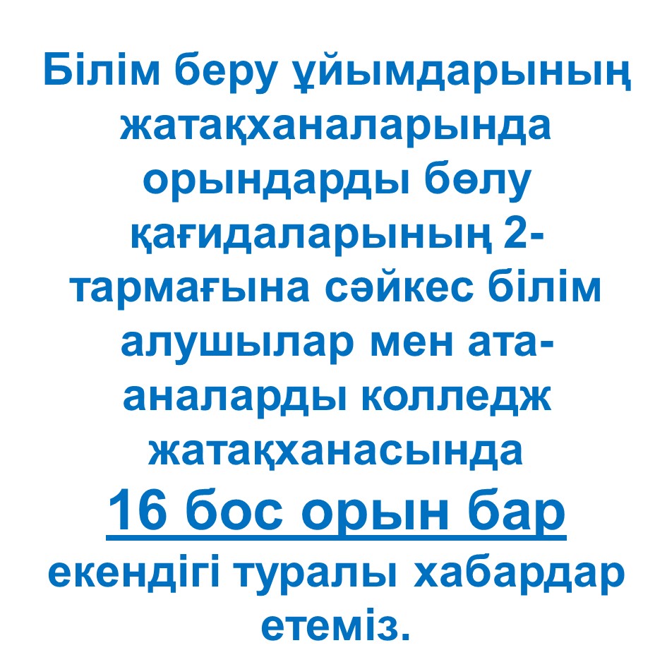 В соответствии с п.2 Правил распределения мест в общежитиях организаций образования, уведомляем обучающихся и родителей о том, что в общежитии колледжа имеется 16 свободных мест.